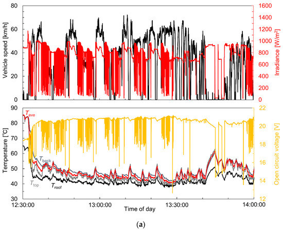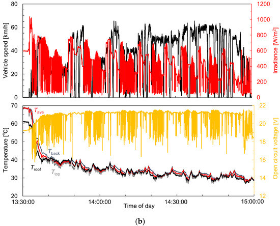 Measured values in the daytime experiment: (a) small van and (b) sedan. The upper graph shows the vehicle speed (black) and solar irradiance at P1 (red). The lower graph shows the module top surface temperature Ttop (gray), back surface temperature Tback (blue), and average temperature Tave (red) at T1. Tave is the average of Ttop and Tback. The open circuit voltage Voc of the VIPV module is also shown (yellow).