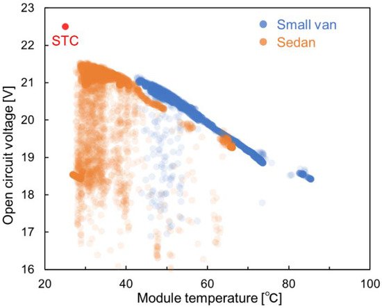 Figure 11 shows the relationship between the Voc of the VIPV module and the average temperature of the module averaged over T1, T3, and T5. For reference, Voc under the standard test conditions (STC, module temperature 25 °C, solar irradiance 1000 W/m2, AM1.5 G) is also plotted in the figure. The linearly decreasing trend of Voc with respect to average module temperature confirmed that the power generation performance of the VIPV module was primarily affected by forced convection. Regarding the small van experiment conducted in summer, the Voc changed linearly in the range of 82% to 93% of the STC value over the course of 1.5 h due to the change in convective heat transfer. Furthermore, Voc was affected not only by the module temperature but also by the fluctuation in solar irradiance, which was not caused by changes in weather conditions but by the shadows cast by building structures and trees on the vehicle roof. The scattered data below the linearly decreasing trend in Figure 11 can be attributed to the fluctuation in solar irradiance.