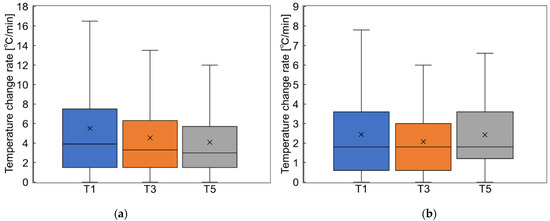 Box plots of the absolute temperature change rate |dTave/dt| at T1, T3, and T5 on the VIPV module: (a) small van and (b) sedan.