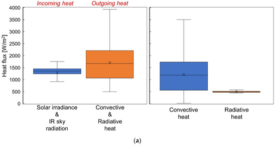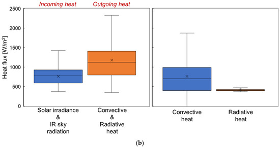 Figure 13 shows the heat budget of the VIPV module analyzed using the measured dataset averaged over T1, T3, and T5. The left graph shows the box plots of the incoming and outgoing heat fluxes. The incoming heat flux to the VIPV module is composed of solar irradiance and IR thermal radiation flux from the sky, whereas the outgoing heat flux from the VIPV module is composed of convective heat flux and radiative heat flux from the VIPV module. Here, the empirical equations obtained from the nighttime experiment were used to calculate the convective heat flux, and the measured module top temperature and emissivity were used to calculate the radiative heat flux from the VIPV module. The left graph clearly shows that the outgoing heat flux has a larger level and wider range than the incoming heat flux for both vehicles. The right graph shows the breakdown of the outgoing heat flux, that is, the convective and radiative heat fluxes from the VIPV module. Obviously, convective heat flux plays a dominant role in the heat budget of the VIPV module, that is, the module temperature, compared to radiative heat flux. Specifically, the range of fluctuation in the convective heat flux was 19–27 times wider than that in the radiative heat flux.