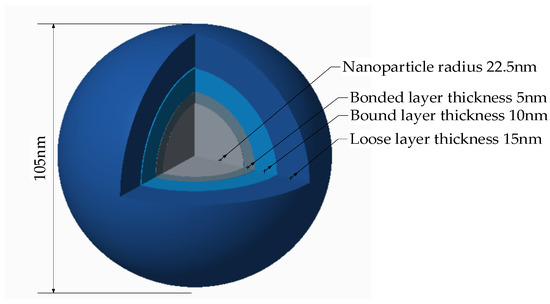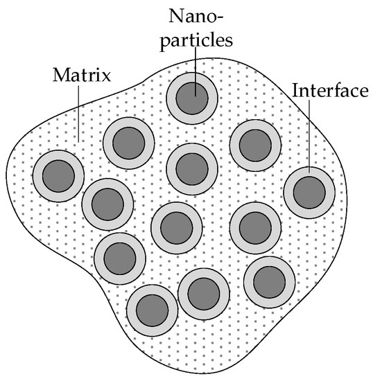 By adding inorganic nanomaterials and semiconducting fillers to polymeric insulating materials simultaneously, the breakdown strength of the composite dielectric will be productively improved, and the nonlinear conductivity will show up in the dielectric. The nonlinear properties are closely related to the filler content. Usually, when the concentration of semiconducting filler reaches a certain level or more, the composite material can reveal obvious nonlinear conductivity, and the nonlinear properties intensify as the filler concentration increases. However, the high content of semiconducting materials will lead to less breakdown strength and mechanical properties, which limits the application of nonlinear materials [1,2,3]. The substances of inorganic nano-oxides can capably help the breakdown strength of materials, such as SiO2 [4], Al2O3 [5], MgO [6], TiO2 [7], ZrO2 [8], ZnO [9], etc. The agglomeration phenomenon occurs when the nanofiller is excessively loaded due to the small size effect of nanoparticles with high surface energy, which declines the performance of nanocomposites [10,11,12]. The present research about nanodielectric is conducted on the interface, i.e., the nanoscale transition region between nanoparticles and polymer matrix, and the nanoparticle interface is schematically shown in Figure 1.