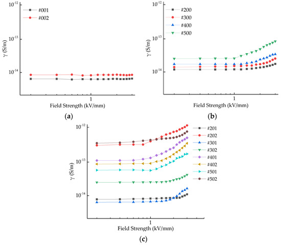 The latter sample is abbreviated as EP-xSiC-ySiO2, where x is the mass percentage of SiC filler and y is the mass percentage of SiO2. Figure 2a shows the variation of conductivity with nanoparticle doping; the EP-ySiO2 specimen has low conductivity and does not show non-linear conductivity characteristics; the composite conductivity increases with the increase in nanofiller content. Figure 2b shows the variation of the composite conductivity with micron SiC concentration for no nanoparticle doping. At a SiC doping of 20 wt%, the initial conductivity is low and shows a small increase at high fields. The micron SiC doping of 30 wt%–50 wt% shows similar ohmic conductivity characteristics at low electric fields. As the electric field intensity increases, the nonlinear conductivity electric field threshold decreases, and the nonlinear coefficient gradually increases with increasing micron SiC doping concentration. Figure 2c shows that at a nano SiO2 doping concentration of 1 wt% and micron SiC doping concentration of 30 wt% or less, the ternary composite dielectric conductivity decreases compared to the micron composite, while the nonlinear slope increases compared to the EP-xSiC specimen.