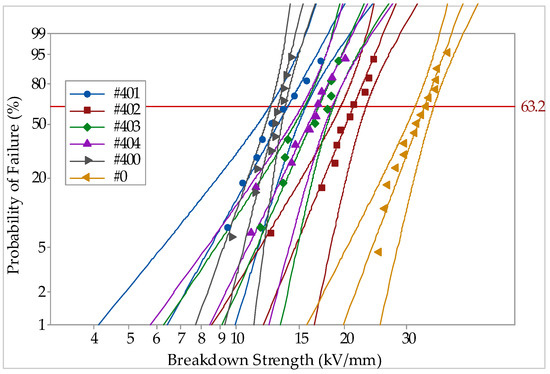 In this section, the effect of nano-doping concentration on the breakdown strength of composites in ternary composites is investigated, and micro-nanocomposites with micron concentration of 40 wt% are selected as breakdown specimens. The Weibull distribution of epoxy resin-based micro-and nanocomposites with different SiO2 content specimens is shown in Figure 3. Weibull parameters of samples with different SiO2 content are listed in Table 2.