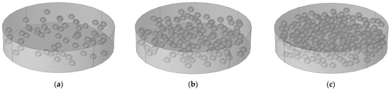A micron dielectric model with SiC micron particle content of 10 wt%, 20 wt%, and 30 wt% were established, and we randomly generated micron particle spatial coordinates using the MATLAB random function rand, as shown in Figure 4, and the corresponding numbers of SiC micron particles are shown in Table 5. The first type of boundary conditions of the current physical field of the micron dielectric model is set as follows: the upper surface potential is 200 V, the lower surface grounded, constituting an applied electric field of 2 kV/mm.