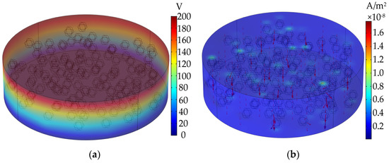 Taking the micron SiC doping content of 20 wt% as an example, the potential distribution cloud at an applied electric field of 2 kV/mm is shown in Figure 5a, and the potential varies uniformly over the epoxy resin according to the law shown in the potential cloud distribution. The volume current density under this electric field is shown in Figure 5b, and its bulk average current density is calculated as 6.71 × 10−9 A/m2, compared with the current density of #200 specimen in Figure 2a as 2.74 × 10−8 A/m2, which is similar in order of magnitude and proves that the simulation results are reliable.