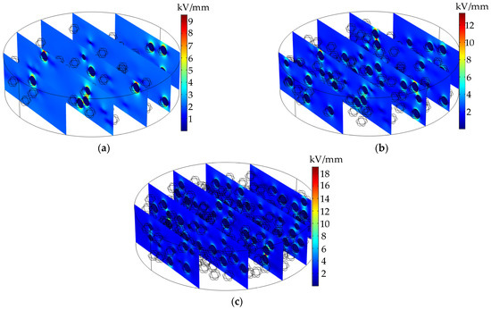 Cross-section of the electric field of the compound model under a constant electric field. (a) 10 wt% SiC; (b) 20 wt% SiC; (c) 30 wt% SiC.