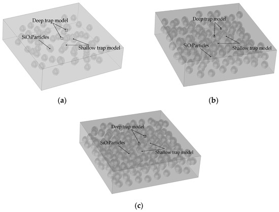 To study the effect of nano-interfaces on carrier migration, randomly distributed multishell SiO2 nanoparticles were added to the epoxy resin as charge traps to simulate the process of carrier capture by charge traps. Jiasheng et al. derived the energy levels and densities of deep and shallow traps in the epoxy resin-based SiO2 nano dielectric based on the Simmons theory of surface potential decay, according to which the energy levels and densities of deep and shallow traps were set [22,23] The trap depths of deep and shallow traps are 0.99 eV and 0.925 eV, and the densities of deep and shallow traps are 2.8 × 1018 and 2.2 × 1018 eV−1∙m−3. The bonding layer is set to a deep trap and 1.11 eV above the trap depth of the substrate itself, and the loose layer is set to a shallow trap of 0.93 eV, stopping the motion of the particles when the electrons pass through the trap range if the energy is below the trap depth. The trap will capture the carriers injected into the substrate material, and the capture chance is usually determined according to the capture cross-section, which is larger for the shallow trap than the deep trap, so the shallow and deep trap cross sections are set to 10−14 m2 and 10−16 m2 [24]. As there is a certain law for the distribution of nanoparticles in the medium, the distance between two adjacent nanoparticles at a certain concentration in the ideal case of no agglomeration is [25]: