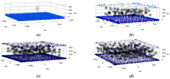 The Schottky emission current, as the input current of the material, was used, and the number of input electrons was fixed at 1000 electrons to observe the motion trajectory of electrons after entering the epoxy resin matrix. Figure 9 shows the motion of electrons at each doping concentration. Assuming that the obstruction effect of the epoxy resin matrix on the electron motion is ignored, when the electrons enter the medium, only a small part is trapped, and the rest all enter the inside of the medium. Based on the epoxy resin matrix model, when 1 wt%, 2 wt%, and 3 wt% of SiO2 nanoparticles are added inside the epoxy resin, part of the electron motion is restricted by the internal potential barrier and cannot enter the medium (the arrow in the figure represents the location of the charge and the direction of electron motion). The presence of nanoparticles provides a large number of deep and shallow traps, resulting in charge trapping near the cathode, and the hindering effect on the injected charge becomes stronger with the increase in nanoparticle doping concentration.