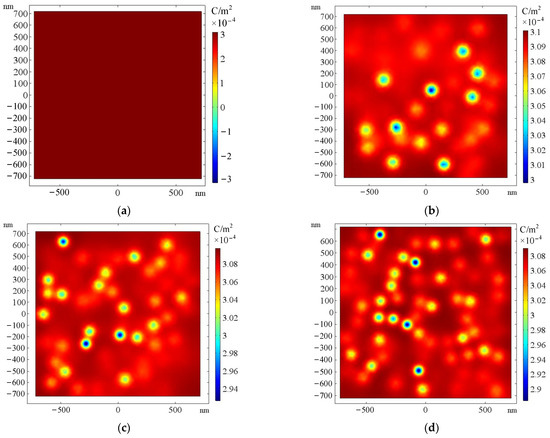 Figure 10 shows the space charge distribution on the surface of the composite anode for different nano-doping contents. Due to the small size of the model compared to the size of the anti-corona layer of the motor wire rod, which can be considered as only one point, the charge concentration in the conforming model is not discussed. In pure epoxy resin, the surface space charge is 3.1 × 10−4 C/m2, and the surface space charge density of nanocomposite anodes at 1 wt%, 2 wt%, and 3 wt% nano-doping concentrations all show regions of lower surface space charge density at local locations and the regions of lower space charge density increase as the nano-doping concentration increases. The average surface space charge on the anode surface of each specimen was averaged, as shown in Table 8, and the average surface charge density gradually decreased with the increase in nano-doping concentration, reflecting that nano-doping has a good inhibitory effect on space charge aggregation.