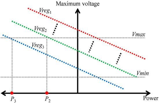 To demonstrate the proposed approach to control OLTC, Figure 1 presents graphically an example of the mathematical models to estimate maximum voltage in the network (the vertical axis) based on the active power flows at the distribution transformer (the horizontal axis). Multiple curves are also presented. Each of them corresponds to a particular value of LV busbar voltage (Vreg). The upper curve (red line) is the one with the highest target voltage (Vreg1). It can be seen that the maximum voltage increases linearly with higher levels of export power at the distribution transformer (i.e., negative values of active power flows). It can be noticed that it is possible to estimate the occurrence of a voltage rise problem based on the intensity of export power. With a busbar voltage of Vreg2 (green line), for instance, it can be expected that one of the customers (at the least) receives voltage beyond the upper statutory limit (Vmax) when the absolute value of export power exceeds P2. Once the control approach detects the existence of voltage issues, the LV busbar voltage has to be updated. Let us assume that the reverse power flow throughout the transformer is P3 while the LV busbar is set to Vreg2. This means that there is a voltage rise problem in the network. By adjusting (reducing) the target voltage of the OLTC to Vreg3 (blue line), it is possible to bring back customers’ voltages within limits. Before updating the target voltage to Vreg3, it is important to check whether it may cause voltage drop issues at demand-led LV feeders. This is performed by estimating the minimum voltage in the network using the corresponding offline defined mathematical models. Thus, the best LV busbar voltage is selected to maintain customers’ voltages within the upper and the lower limits. The control logic continues monitoring power flows throughout each control cycle (e.g., every five minutes) of the transformer to estimate customers’ voltages and update the OLTC’s set point.