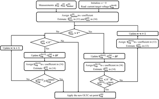 This section provides a description of the proposed control logic of the OLTC to manage voltages in LV distribution networks. Typically, the OLTC is fitted at the high voltage side of the distribution transformer. By using an automatic voltage control relay, the tap ratio of the OLTC is automatically adjusted to regulate the voltage at the LV busbar of the distribution transformer close to a predefined desired target voltage (). When the measured voltage at the LV busbar () is outside the allowed voltage tolerance (e.g., bandwidth) for consecutive time steps (e.g., 2 min), the control logic is triggered to change the tap position. The required number of tap changes is determined according to the voltage difference between the measured LV busbar voltage and the desired target voltage. Thus, the selection of the target voltage is crucial to ensure the effective voltage management of customers’ voltages within their allowed upper and lower limits (). Taking into account that the proposed voltage management approach is communication-free (without remote monitoring elements), customers’ maximum and minimum voltages () have to be predicted in real time. For this purpose, the functions developed in Equations (13) and (14) are considered by the control logic to guess customers’ voltages according to the real-time active and reactive power measurements throughout the transformer (,) and the voltage of LV busbar (). This means that the desired target voltage keeps adjusting in real-time according to the estimated customers’ maximum and minimum voltages. The proposed control logic is shown in Figure 2. The control logic aims to adjust the target voltage from its current value () by n discrete number of voltage step such that the estimated customers’ maximum and minimum voltages are kept within their limits. Each voltage step corresponds to the voltage change per one tap change. Due to the voltage capabilities of OLTC, the new target voltage has to be kept between its minimum and maximum values (, ).
