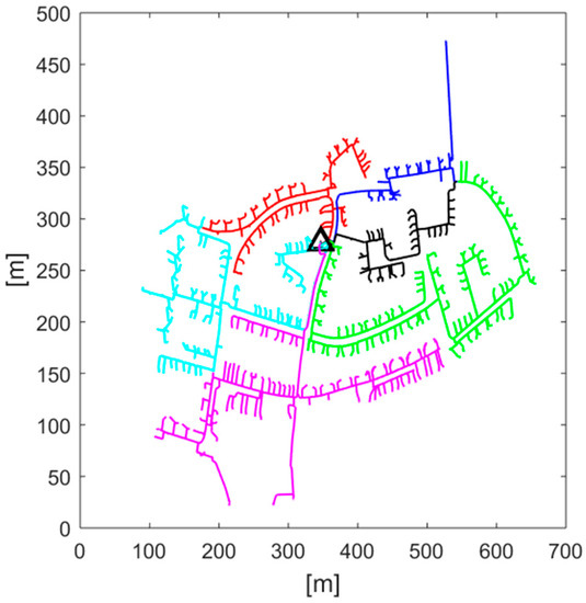 The proposed approach is applied to a real underground residential LV network (located in the North West of England) [31]. The network (11 kV/415 V) consists of six radially operated feeders (each one is three phases and four-wire cables). A single-line schematic of the studied network is shown in Figure 3 on which the triangle shape represents the distribution transformer (rated capacity 500 kVA). The LV Feeders are presented with different colors. All customers are with single-phase connections. For this purpose, the distribution network analysis software package OpenDSS is utilized to perform time-series and three-phase unbalanced power flows [32].
