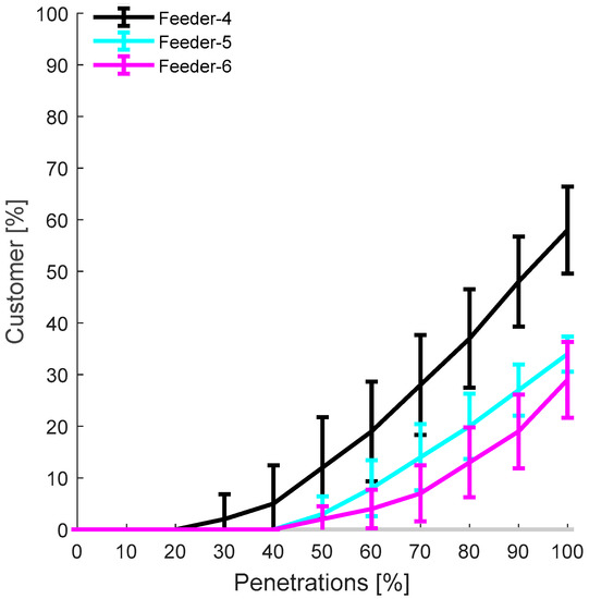 The analysis considers 11 PV penetration levels (from 0 to 100 with an increment of 10%, in this case). Consequently, from carrying out all power flow simulations as shown in Figure 4, voltage rise problems appear at PV penetrations of 30%, 50%, and 60% in Feeder-4, Feeder-5, and Feeder-6, respectively (no voltage issues in the other feeders). From the network perspective, voltage rise occurs at 30% PV penetration.