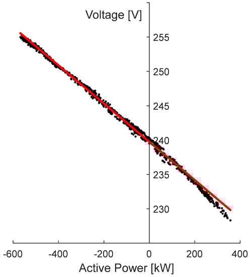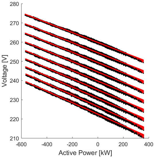 To perform the curve fitting technique, it is also required to define the shapes of the curves (e.g., linear). Taking into account the high ratios of resistance to the reactance of LV lines (i.e., R >> X) and the relatively very small changes in voltage phase angles in LV networks, linear relationships are adopted. Thus, it is assumed that the customers’ voltages are linearly varied according to the changes in the power measurements at the distribution transformer. The functions to estimate customers’ maximum and minimum voltages are formulated in Equations (13) and (14), respectively. It is worth highlighting that the functions are also produced for different values of LV busbar voltages.