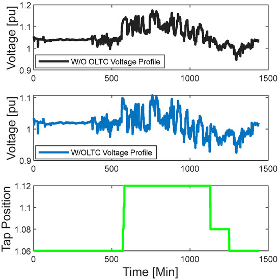 In a given simulation, customer demand and PV output are chosen from the matrix for the same household and presented in Figure 8. This shows how significant voltage reduction benefits from the adoption of OLTCs for the maximum voltage in the network to be obtained. It can be observed from the figure that the tap is positioned at the maximum level, which indicates that no room is left for improvement (the best potential improvement is covered). Thus, the performance could be considered as the maximum benefit that the proposed control approach can offer.