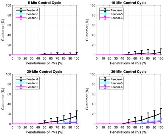 In order to realistically assess the effectiveness of the decentralized control approach, the impact analysis for different control cycles is shown in Figure 9. Analysis results indicate the effectiveness of the hosting capacity for the 5 and 10 min control cycle in the first row from left to right, and the 20 and 30 min control cycle in the second row. It is evident that for different control cycles, the performance of the adopted control strategy brings benefits to the network. All feeders (except Feeder-4) manage to keep their voltage within statutory limits (BS EN50160) for the 5 min control cycle. Even Feeder-4 denotes significant improvement in terms of hosting capacity.