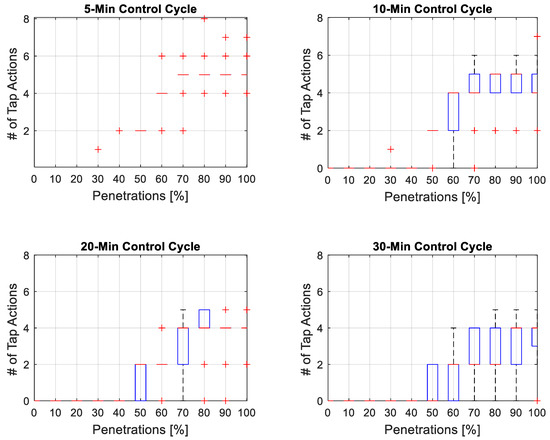 With larger control cycles, customers with voltage rise issues appear with different feeders. Furthermore, the number of customers having voltage rise issues increases with greater control cycles. The number of tap operations in different control cycles is shown in the box plot in Figure 10, in which it is evident that with greater control cycles, tap operations decrease. Therefore, a DNO can adopt the strategy to use a larger control cycle till technical issues emerge. Afterward, a lower control cycle will facilitate the higher hosting capacity.