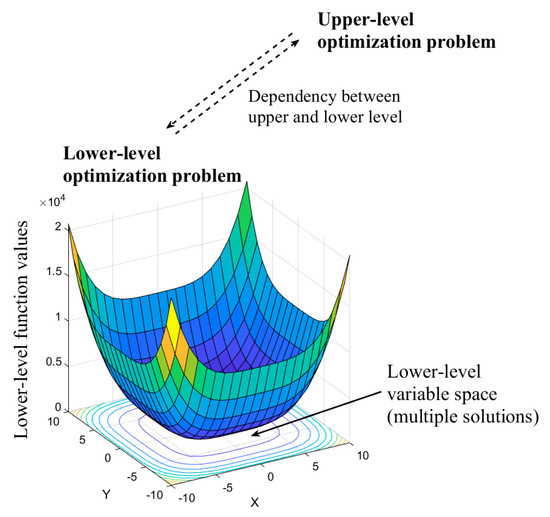 The literature review reveals that the bidding optimization problem of market participants is typically formulated as a bi-level optimization problem and, despite having different assumptions, modifications, and hybridizations of algorithms, finding optimal and near-optimal solutions to the problem remains a major challenge in the field. Concerning the application of metaheuristics, the no free lunch theorem [22] of optimization also proves that designing an algorithm that consistently provides effective and robust solutions for all types of complex non-linear problems is not possible. Recently, hybridization of evolutionary algorithms has attracted attention for solving energy market problems, due to their ability to handle non-linearity and uncertainty [20,23,24]. Typically, a bi-level optimization problem is inherently highly nonlinear [25], non-convex, non-differentiable, discontinued and NP-hard [26]. Also, it is common to have a nonlinear lower-level problem with multiple optimal solutions, as shown in Figure 1. In addition, upper- and lower-level problems are mutually dependent.