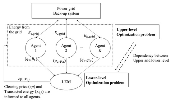 The LEM bidding optimization problem is modeled as a bi-level optimization problem in which the upper-level problem corresponds to the maximization of agents’ profits and the lower-level problem to the maximization of energy transacted in the LEM [27]. Thus, the solution of the lower-level affects the upper-level by modifying the profits of all agents.