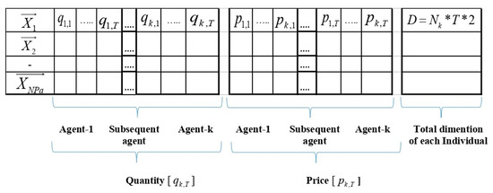 As showed in Equation (6), the bi-level optimization model tries to maximize profit of all agents by executing optimal bidding of agents in the LEM. Let, be a set including all agents (producers and consumers). The aim is to find the best tuple representing the quantity of active power and optimal price to bid in the LEM for each agent. The bidding is done for all optimization periods. periods are considered for the day-ahead market. Thus, the vector of optimization variables is represented as , where is the quantity and is the price that the agent submits to the LEM at time period . A sign convention is used to define consumer and producer types. A positive quantity represents a bid (i.e., buying in the LEM), and a negative quantity represents an offer (i.e., selling in the LEM). Thus, the action of an agent can be controlled by defining the bounds of variables in which consumer agents can submit bids in the LEM within the bounds (i.e., between 0 and their maximum consumption limit), while producer agents can submit their offers within the bounds (i.e., between 0 and their maximum power production capacity). The minimum and maximum boundary values for prices are in the range and are the same for all agents. Figure 3 shows the structure of a solution (i.e., a particle in our algorithm). Such particles are evaluated in the fitness function returning the mean average profit of all agents, plus the standard deviation, as per Equation (7):