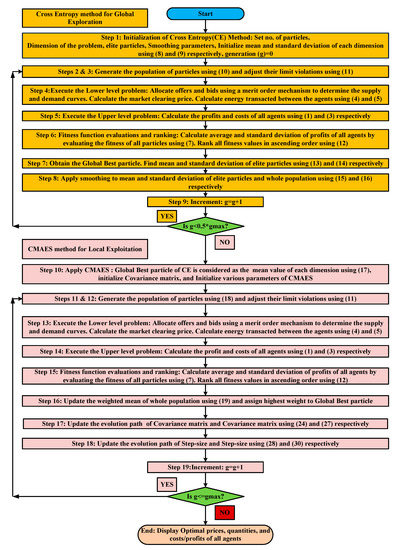 where and are functions that compute the average and standard deviation of the profits that all agents obtained, considering the bids/offers encoded in the particle. The Equation (6) is the objective function to maximize the overall profits, where Equation (7) is the fitness function, which is the sum of the objective function and standard deviation. The negative sign in the first term is used to transform the profit maximization problem into a minimization problem. The less the value in Equation (7), the better the mean profits achieved by all agents. Equation (7) is optimized using the proposed CE-CMAES method, which is described in the following section.