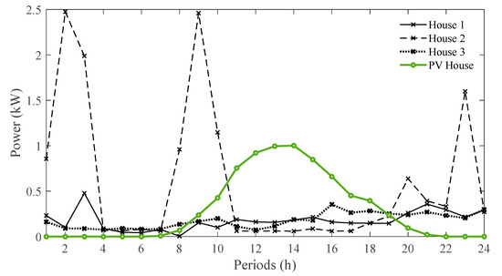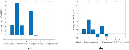 where, is the profit earned by the producer agent j by selling energy to consumer agent and to the grid; is the cost of consumer agent by buying the energy from the agent j and grid. Thus, Equation (6) reflects the maximization of the overall mean profits. The profits and costs are conflicting objectives, since all agents try to achieve the best results for themselves.