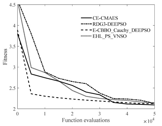 Table 4 depicts the mean fitness of the CE-CMAES algorithm for a different contribution of iterations in CE and CMAES out of the total number of maximum iterations, expressed in percentage. The comparison given in Table 4 proves that CE-CMAES algorithm achieved the best mean fitness when both CE and CMAES were balanced with 50% each of the total maximum number of iterations allowed. This combination gave the slowest convergence of CE-CMAES, due to the time taken by the CMAES for local exploitation of the search space. CMAES finally improved the solution in the last iterations, as shown in Figure 7. For this reason, we used CE first for 50% of total iterations for the global exploration of search space and CMAES for the remaining 50% of total iterations for the local exploitation of search space.