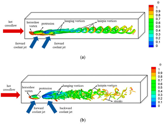 3.2. The Interaction between Crossflow and Double Rows Coolant Jets with Different Jet Orientations