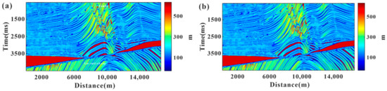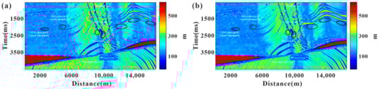 Martin [31] divided the structural elements, horizons, and lithologies of the Marmousi2 model. To further test the estimation effectiveness of the non-stationary random medium parameters proposed in this research, we used a part of the Marmousi2 model for the test. We selected the part of the original Marmousi2 model with a vertical time range of 501–4503 ms and a horizontal distance range of 101–16,900 m for the test. Based on the linearized petrophysical model, porosity, clay volume, and water saturation models were calculated from p-wave velocity, s-wave velocity, and density. Figure 9a–c display the porosity, clay volume, and water saturation of the Marmousi2 model, respectively. The model contained special geological bodies, such as a gas-charged sand channel, oil-charged sand channel, and large faults. The Ricker wavelet was set with the dominant frequency of 35 Hz, and Figure 9d–f are synthetic seismic records with central angles of 7°, 18°, and 26°, respectively. The non-stationary random medium parameters of porosity, clay volume, and water saturation were estimated based on the proposed method, and the parameter estimation results are depicted in Figure 10.