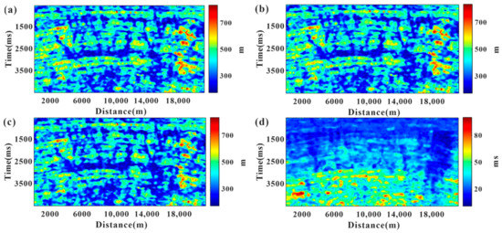 The robustness of the method in this paper is verified by the noise test under different signal-to-noise ratios. The test result with a signal-to-noise ratio of 3 is taken, as an example, to show the estimation effect of the method in the case of seismic data with noise. We added Gaussian white noise to the seismic data and used the noise-containing seismic data with a signal-to-noise ratio of three (Figure 7) for the random medium parameter estimation of the petrophysical parameters. The sliding window is set to 300 × 300. Figure 8 exhibits the parameter estimation results, in which the estimation errors of horizontal autocorrelation length and autocorrelation angle of petrophysical parameters are smaller than those of vertical autocorrelation length, and the average error of parameter estimation can be controlled within 25%. The estimation result can also identify the four layers with clear differences and has better noise immunity.