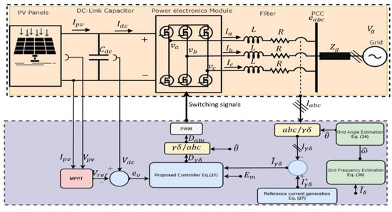 In this paper, a single-stage, three-phase, grid-connected photovoltaic system is controlled by a novel nonlinear current controller. The main contribution of the proposed controller is that the current tracking objective is achieved without knowledge of the grid phase angle and frequency. To do so, an estimated rotating reference frame (γδ-frame) is utilized [27]. Moreover, the proposed control scheme ensures that tracking of the DC-link capacitor reference voltage-generated from MPPT algorithm is achieved. This algorithm ensures the PV array(s) achieves their maximum power operating point. Within the control scheme, adaptive compensation terms facilitate the voltage and current tracking objectives and simultaneously account for the unavailable grid frequency and phase, hence eliminating the need for an additional feedback system for synchronization, such as a PLL. The voltage sensors required for PLL-type systems are expensive and introduce electrical noise and dc offsets, which must be compensated for in other ways.