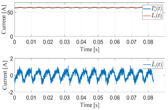 In the first scenario, the tracking performance of the proposed controller/observer scheme, the PV system experiences standard atmospheric conditions for which the irradiation and the temperature are and , respectively. The -axis currents with their respective reference currents are shown in Figure 3 and Figure 4. It can be seen that -axis currents successfully follow the reference currents. The root mean square (RMS) of the steady-state errors for active and reactive currents and are calculated to be 0.45 A and 0.06 A, respectively. Figure 5 shows the voltage of the DC-link capacitor and the reference voltage generated by the MPPT algorithm (the MPPT algorithm will not be studied in this work). It is clear that the DC-link voltage tracks its reference voltage with the RMS steady-state error, which is around 0.1 V. The controller output (Duty cycle) that is needed for the proposed controller/observer scheme for the PV single-stage, three-phase, grid-connected inverter is shown in Figure 6. The observer of the grid angle follows the angle generated from PLL as shown in Figure 7. The PLL algorithm is used here only for comparison and is never used in the control scheme.