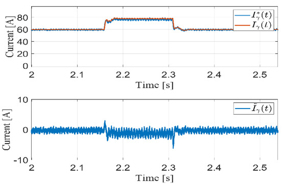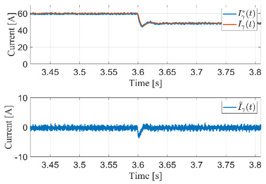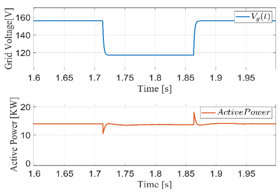 Generally, LVRT is a common disturbance in the utility grid voltage which creates a severe operating condition for PV grid-connected inverters. An LVRT scenario has been employed to test the robustness of our proposed controller/observer scheme against this type of grid disturbance. This scenario is emulated by dropping the magnitude of the grid voltage from to for . Figure 12 shows the active power injected into the grid during this kind of disturbance along with the grid voltage profile. As can be seen, the controller maintains constant power output to the grid. Since the grid voltage decreases, the only way to keep the power constant is to increase the current supplied from the PV system. In this case, the current limiter is added to the circuit in order to keep the current within the PV panel-rated current if the voltage drops to severe levels. Figure 13 shows the tracking performance of the injected current in this operating point.