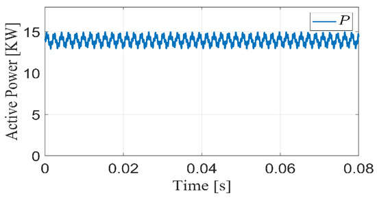 Harmonics are very common in grid voltage. The effect of these harmonics on renewable based power systems must be tested. In this scenario, the gird voltage with a Total Harmonics Distortion (THD) of 16% is used in order to demonstrate the capability of the proposed controller to harvest the maximum power from the PV panels and to inject power into the grid. Figure 14 shows the active power that is injected into the grid. Figure 15 shows the controller performance—in this case, in terms of the error signals for the injected currents and DC-Link voltage. Moreover, Figure 16 shows the proposed observer performance for the phase angle and frequency of the grid voltage.