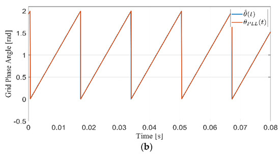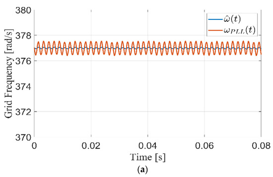 Steady-state observer performance under distorted grid (a) grid frequency [rad/s] (b) grid phase angle [rad].