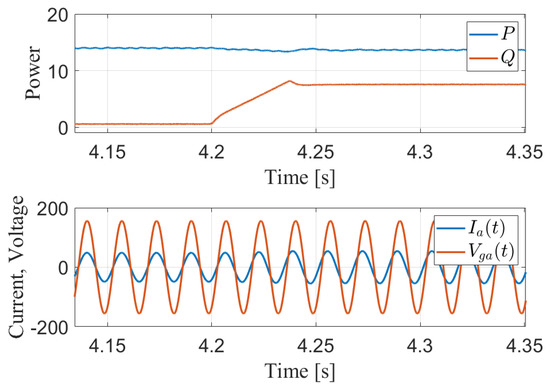 The proposed controller has been designed to handle both active power harvesting and reactive power injection operating conditions. In this test, the reactive power injection condition is applied by increasing the q-axis reference current to inject 7.5 KVAR into the grid. Figure 17 shows the performance during the injection condition. It is seen that the reactive power is injected with a small percentage overshoot of less than 5%. Moreover, Figure 17 shows the power factor at the grid side before and after reactive power injection. The power factor is unity before the injection instant and is calculated to be 0.86 after the injection of reactive power since the phase angle between the voltage and current is around .
