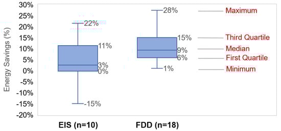 Table 2 shows EIS and FDD energy and cost savings for the first and second years after implementation. As described in Section 2.1, savings are calculated by comparing baseline year energy data before the tool was in place with data from the years after analytics implementation. By the second year of after the technology was installed, 10 organizations with EIS achieved energy savings ranging from −15% to 22%, with a median annual energy savings of 3% and associated cost savings of 0.32 USD/m2 (0.03 USD/ft2). Eighteen organizations with FDD achieved energy savings ranging from 1% to 28%, with a median annual energy savings of 9% and associated cost savings of 2.58 USD/m2 (0.24 USD/ft2) (Figure 2). The second-year savings were selected as a reliable representation of energy savings benefits from using EIS and FDD because both tools are usually incorporated into the building energy management process, and it takes time for the users to gain experience with the tool, establish routine processes to act upon suggestions, and take actions.
