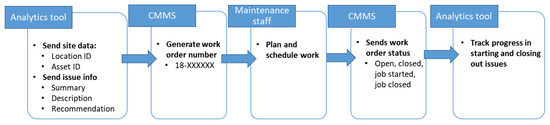 Link building analytics tools to a work order system: Organizations commonly use a computerized maintenance management system (CMMS) to help manage assets, schedule maintenance, and track work orders. Linking a building analytics tool to a CMMS is a reliable way to integrate issue resolution into daily maintenance practices. By doing so, a work order for correction can be created for any issue reported from the tool, and progress toward resolution can be tracked. Figure 5 shows how one campaign organization integrates the building analytics and CMMS workflow. The analytics tool and the CMMS communicate via a web application programming interface. When an issue is reported by the analytics tool, the facility staff initiates a request for a work order within the tool, which generates a work order in the CMMS, and using the application programming interface, transfers information to the work order description. Maintenance staff then take action and complete the work. The work order status can be transferred back to the analytics tool to close the issue.