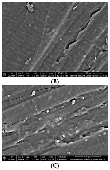 SEM images of silicone rubber nanocomposite samples, (A) 0.5% SiO2, (B) 0.5% TiO2, (C) 0.5% ZrO2.