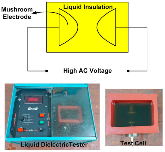 A breakdown voltage test was performed on the transformer oil nanofluid samples at room temperature (20 ± 5 °C) using a liquid dielectric test set according to ASTM D1816 standard. A schematic diagram of the experimental setup is shown in Figure 3. The breakdown voltage test was carried out using 500 mL of each prepared oil sample (at each concentration) using the standard test cell, also shown in Figure 3. The test cell used in the test had two mushroom-shaped (VDE) electrodes with a 2 mm spacing between them, complying with the adopted standard. During the test, the rate of voltage rise was kept constant at 500 V/s and the frequency of the applied voltage was 50 Hz. Each sample was tested 10 times using the same sample, with a 2 min time interval between each two consecutive breakdowns. The average breakdown strength and breakdown strength at 10% and 50% probabilities were estimated according to Weibull’s statistical technique. An evaluation of breakdown strength based on 10% probability was conducted as it gives an indication about oil reliability, while the breakdown strength at 50% probability gives the average value using a statistical technique.