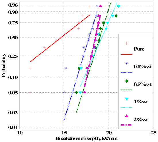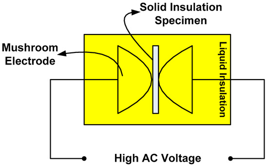 The breakdown strength for silicone rubber samples was measured at room temperature (20 ± 5 °C) using the same test-cell configuration and the same rate of voltage rise. The schematic diagram of the test setup is shown in Figure 4. During the measurement of breakdown strength, the silicone rubber sample was inserted between the two electrodes through the liquid insulation (transformer oil) to prevent the occurrence of surface flashover. Each sample was tested 10 times (using a new specimen for each breakdown voltage test); average breakdown strength, as well as breakdown strength at 10% and 50% probabilities, was calculated using Weibull’s statistical technique.