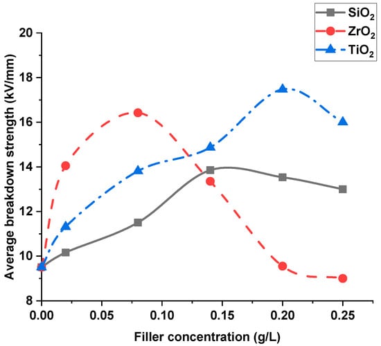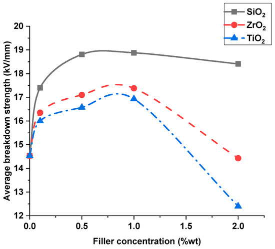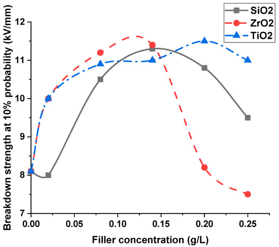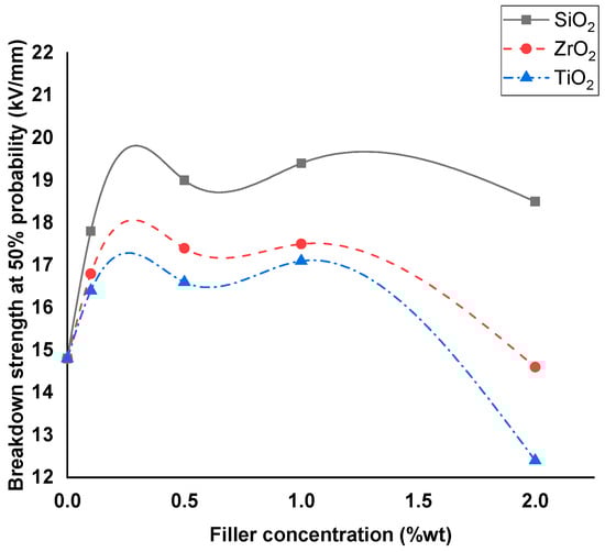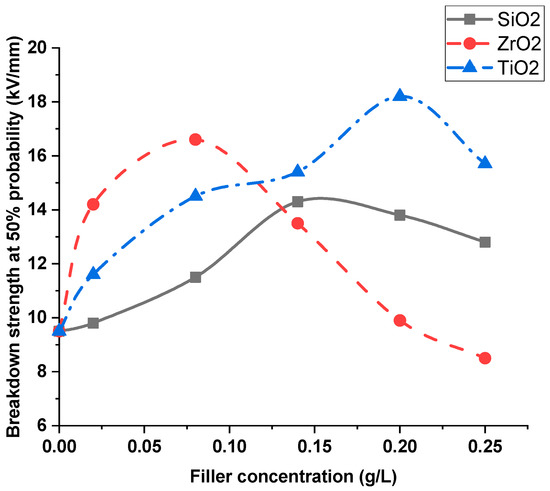 In this section, the breakdown strengths of nanofilled transformer oil and silicone rubber nanocomposites are evaluated. The evaluation was carried out taking into account the effects of the nanoparticle dielectric constant and nanofiller concentration. The effect of the dielectric constant of nanofillers was studied using the three previously specified nanomaterials, which have different dielectric constants. These materials were SiO2 (dielectric constant = 4.3), ZrO2 (dielectric constant = 70) and TiO2 (dielectric constant = 100). The evaluation was based on the average value of breakdown strength, as well as breakdown strength at 10% and 50% probabilities.