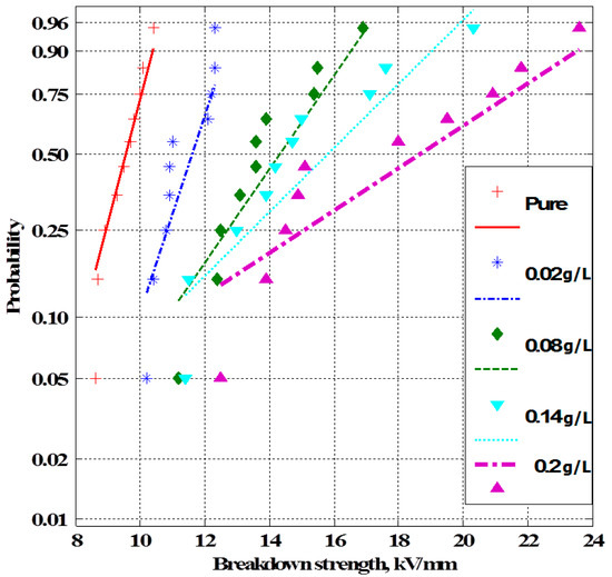 Figure 6 shows Weibull’s probability curves for the breakdown strength of transformer oil containing TiO2, which gives the maximum percentage increase. It demonstrates that, by increasing the TiO2 concentration level, the breakdown strength increases at all probabilities. Figure 7 and Figure 8 show the effect of concentration level, as well as nanoparticle material types, on the breakdown strength at 10% and 50% probabilities. These figures demonstrate that the breakdown strength at 10% and 50% probabilities increases by increasing the nanoparticle concentration level up to its optimal value, after which it decreases. Furthermore, the nanoparticle material type (dielectric constant) affects the breakdown strength of transformer oil. It can be seen that adding TiO2 to transformer oil gives a maximum percentage increase in breakdown strength at 10% and 50% probabilities compared with the other two particle material types. This, therefore, validates the increase in the nanoparticle dielectric constant giving a higher increase in the breakdown strength of transformer oil nanofluids.