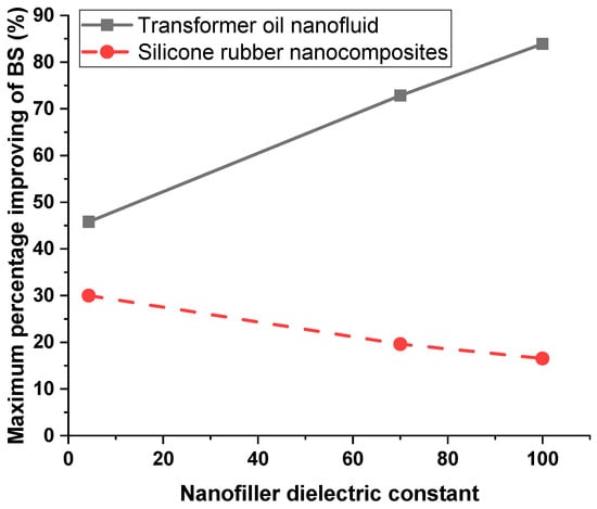 As mentioned earlier, surface charges accumulate on nanoparticles surfaces when the nanodielectric, whether liquid or solid, is exposed to an external electric field. The accumulation of surface charges, called trapping, is the major reason behind the improvement in breakdown strength of both liquid and solid dielectrics. Hence, the charge-trapping process reduces the energy of free charges generated by ionization, which leads to a higher breakdown strength. The increase in the dielectric constant of nanofillers results in a higher increase in the breakdown strength of nanofluids. As the increase in the nanofiller dielectric constant results in more surface charges on the nanoparticle surface, this latter increase in surface charge results in a higher attraction force with the electrodes. This results in a higher nanoparticle speed and, therefore, a greater reduction in the kinematic energy, as well as the momentum, of free charges in liquid dielectrics. This leads to a higher nanofluid breakdown strength with the increase in nanoparticle dielectric constant. However, the increase in the nanoparticle dielectric constant leads to higher electric field strength at the nanoparticle/solid interface due to the formed surface charges on nanoparticle surface. This increase in electric field strength allows local discharges at the nanoparticle/solid interface and, therefore, a lower percentage improvement in its breakdown strength. This means that using nanoparticles with high dielectric constants is recommended with nanofluids in order to obtain higher percentage increases in their breakdown strength. However, nanoparticles with lower dielectric constants are recommended with solid nanocomposites to increase their breakdown strength.