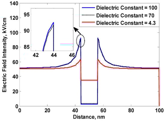 It was also found that the increase in the nanofiller dielectric constant results in a higher percentage increase in the breakdown strength of the nanofluid. However, a lower percentage increase was found to occur when using solid nanocomposites, as previously described in Figure 13. This behavior requires further discussion to achieve a deeper understanding of the role of nanofillers in improving the breakdown strength for both liquid and solid dielectrics. According to the published literature, the increase in breakdown strength considering nanofluids is a result of moisture binding [21] and the charge trapping process [22]. Moisture binding results from the hydrophilic nature of nanoparticles that reduces the spread of moisture in the fluid, leading, in turn, to an increase in breakdown strength. However, charge trapping reduces the spread of free charges in the fluid; therefore, increased breakdown strength is achieved. On the other hand, the increase in breakdown strength in solid nanocomposites mainly results from the charge trapping process, as reported in the published literature [24,25,26,27]. Researchers, therefore, attribute the improvement in breakdown strength of both liquid and solid dielectrics to the charge-trapping action of nanoparticles. From the obtained results, the percentage increase in breakdown strength increases with the increase in the dielectric constant of nanofillers with liquid dielectrics; however, it decreased with the increase in the nanofiller dielectric constant with solid dielectrics. In our opinion, this behavior is achieved due to the effect of the nanofiller dielectric constant on the formation of surface charges of nanoparticles, as illustrated in the following subsections.