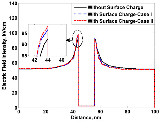 Looking at the obtained breakdown results, the increase in nanofiller concentration level results in an increase in the breakdown strength for both nanofluids and solid nanocomposites until the optimum concentration. However, a reduction in breakdown strength occurs after the optimal concentration level in both nanofluids and solid nanocomposites. This reduction is due to agglomeration and electric field distortion, as reported in [9]. This is because when an external electric field is applied to a nanofluid, the electric field is increased at the nanoparticle/liquid interface. This behavior was validated through the calculation of the electric field distribution, using finite element analysis (FEM). Accordingly, a nanoparticle having a particle size of 10 nm was simulated as a spherical particle. The nanoparticle was simulated as being immersed in a dielectric liquid with a dielectric constant of 2.3, as shown schematically in Figure 14. An external electric field of 10 kV/mm was applied between the electrodes. The nanoparticle dielectric constant was taken to be 4.3, 70 and 100. The presence of the nanoparticle in the dielectric fluid increased the electric field intensity at the nanoparticle/liquid interface, as shown in Figure 15. The electric field at the interface increased with the increase in nanoparticle dielectric constant, as proven from the electric field calculation. This increase in electric field intensity results in the charge trapping of free charges resulting from ionization processes in the dielectric liquid. The increase in the dielectric constant of nanofillers, therefore, results in more improvement in the breakdown strength of nanofluids. However, when the nanoparticle traps the free charges, a distortion in the electric field occurs. The degree of distortion depends on the number of trapped charges. This was validated by using the simulated system in Figure 16, using FEM with a nanoparticle with a dielectric constant of 100. Mixed surface charges (positive and negative with a surface charge density of 10−5 C/m2) were also simulated for two cases, as shown in Figure 16. The first case (Case I) had an angle θ = 60°, whereas the second case (Case II) had an angle θ = 30°. The presence of surface charges on the nanoparticle surface resulted in a distorted electric field, as shown in Figure 17. This figure (Figure 17) illustrates that the increase in nanoparticle surface charges results in more electric field distortion. With the increase in the nanofiller concentration level, the number of nanoparticles increases. Therefore, the space charges increase, causing a severe electric field distortion. The severe electric field distortion can cause partial discharges at the nanoparticle/liquid interface that leads to breakdown at lower voltages. Furthermore, with the increase in nanofiller concentration level, the distance between the nanoparticles decreases. This can cause agglomerations due to the Coulomb’s forces between them. These agglomerations result in lower charge trapping due to the lower resultant surface area, as the increase in particle size reduces its surface area per unit volume. Therefore, because of the agglomerations, the total surface area is reduced with the same filler loading. This effect reduces the capability of charge trapping, which in turns reduces the breakdown strength of nanofluids.