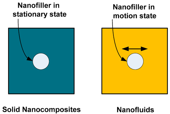 Therefore, the difference between nanofluids and solid nanocomposites is the presence of nanoparticle motion in nanofluids; however, the nanoparticle is stationary in solid nanocomposites, as illustrated schematically in Figure 18.