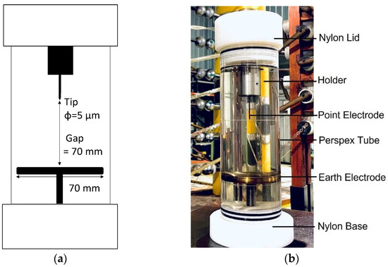 The Perspex test cell: (a) The electrode configuration is point-plane. The point electrode is 50 mm long, with a tungsten tip of radius r = 5 ± 1 μm. The plane electrode is made of brass with a diameter of 70 mm and is earthed. The gap size is 70 mm.; (b) Image of test cell with annotations.