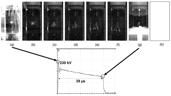 The images for 1% DEA and 1% toluene in cyclohexane, for similar applied voltage levels (230–233 kV), are shown in Figure 2 and Figure 3, respectively. The streamer images shown for 1% DEA in cyclohexane (Figure 2, 230 kV applied voltage peak) represent a “slow” streamer. They are captured with a 4.82 µs exposure time, and 5.55 µs elapsed between frames. Frame (a) represents the first sign of activity from the captured images. Frame (h) represents the frame where the image is fully saturated, signifying the point where breakdown occurred; there is energy follow-through after the breakdown channel is made. The calculated elapsed time between Frame (a) and (h) was 38.85 µs, while the time calculated using the TTB approach (for slow streamers, peak to knee point) was a value of 39 µs. There is therefore reasonable agreement between the TTB approach and the propagation images of the streamer. However, there is some uncertainty derived from the exposure time of the image. A good illustration of this (in Figure 2) is Frame (g), where the breakdown event of Frame (h) is partly visible in the previous frame. In Frame (g), the start of the intense current due to breakdown is registered at the bottom of the image. Frame (h) captured the moment of maximum luminosity of the event and all image pixels saturate. In this instance, the streamers are predominantly of 2nd mode as the overall velocity is inferred to be 1.79 mm/µs.