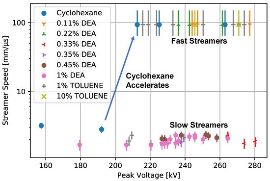 The data in Section 3.2 and Section 3.3 are plotted in Figure 4 below. The error bars represent the uncertainty in the approximate overall streamer velocity. The main source of uncertainty is in the exact TTB, as the streamer can start to propagate at any point on the wavefront (see Section 2.3). There is apparent clustering of the slow streamers (predominantly second mode, around 2 mm/µs) and fast streamers (likely fourth mode, around 90–100 mm/µs). When the DEA concentration is 0.33% and above, slow streamers occur for the entire voltage range in question. Neither 1% nor 10% toluene are effective at slowing streamers above ≈210 kV.
